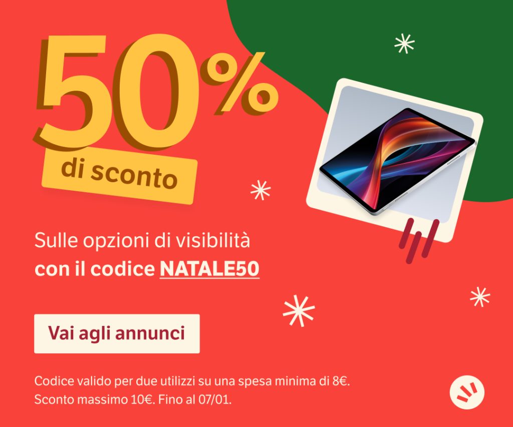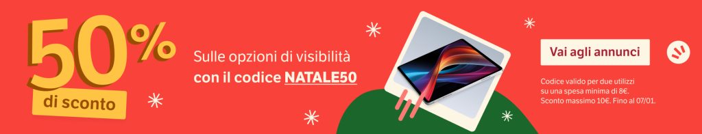 La promo consiste in uno sconto del 50% sull’acquisto delle opzioni di visibilità “Vendilo Subito”. L’offerta è applicabile con il codice “NATALE50“, valido per due utilizzi dal 15/12/2025 alle ore 9:00 fino al 07/01/2026 alle ore 23:59, su una spesa minima di 8 €. Sconto massimo applicabile 10 €. Il codice è valido per tutte le categorie.